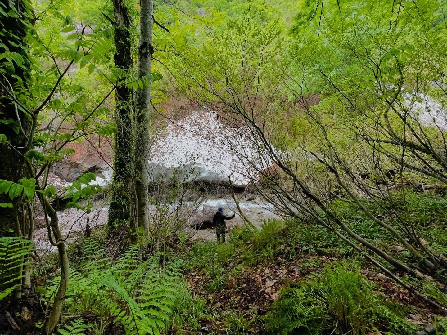水温を測ると6度程、立ち止まると急に感じる水の冷たさと、残雪からもしんしんと冷気が伝わってきて、仲間の竿のトラブルもあり、遡行はここで断念。