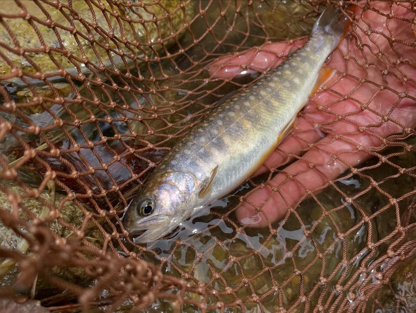 足元を走った影を見つけてすかさず逃げ込んだ岩の隙間をガサしたらまんまとネットに入ってしまったチビ岩魚!笑