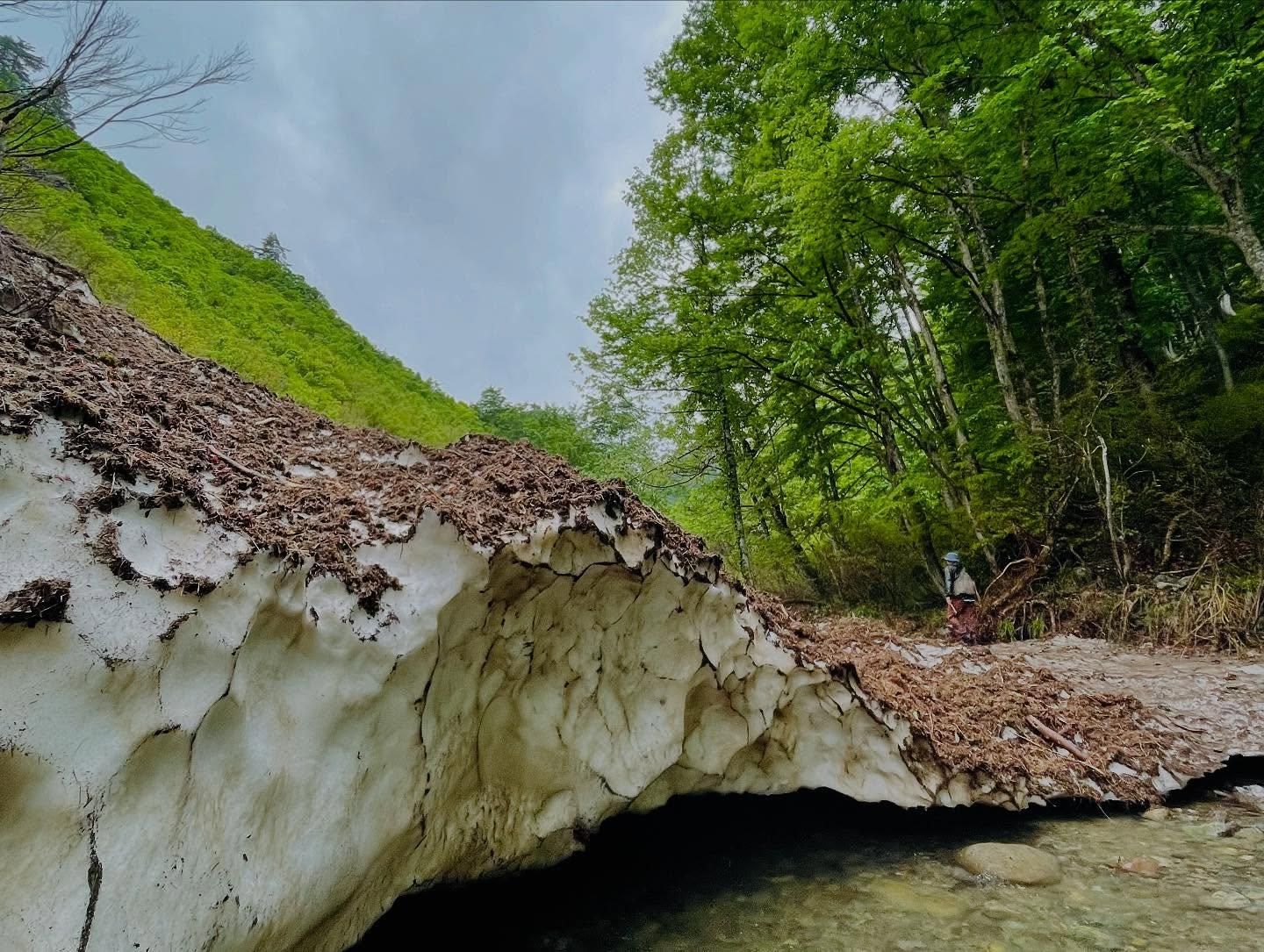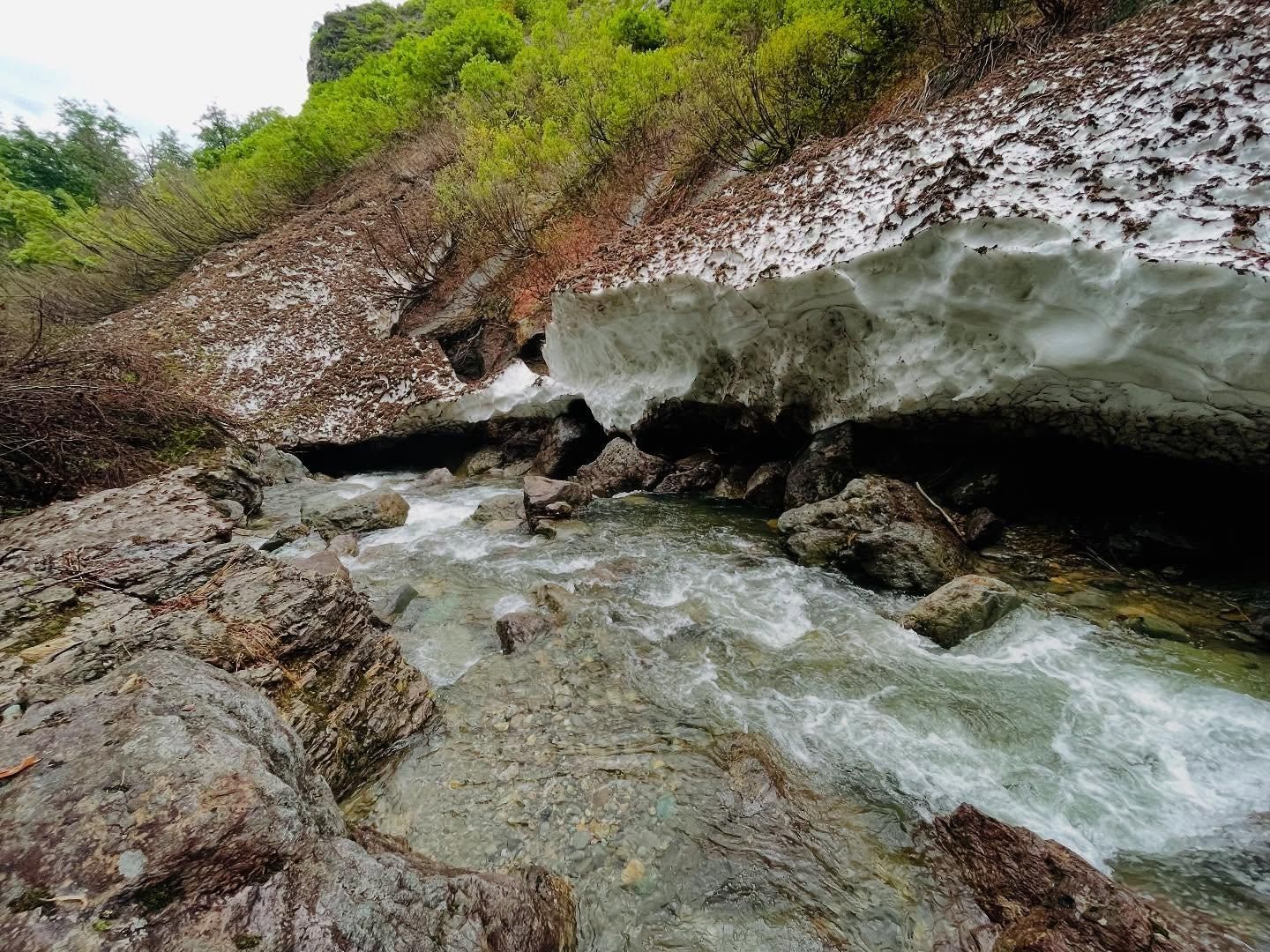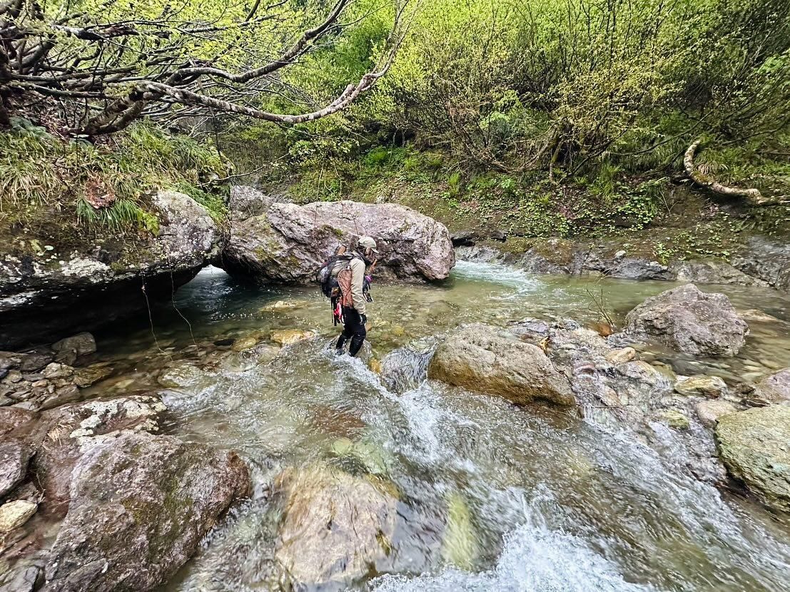 斜面の崩落箇所を慎重に越えて入渓、谷間にはまだしっかりと残雪が残っていました。