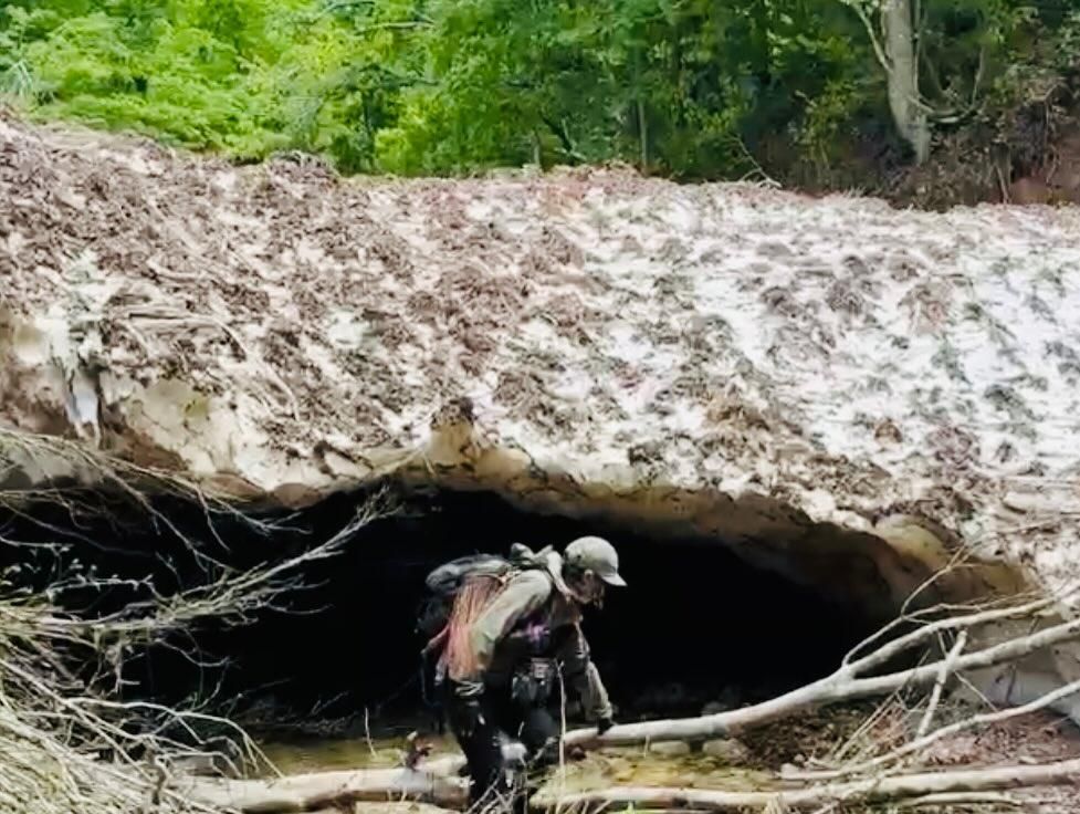 スノーブリッジをいくつも越えながら遡行しますが、魚影はいまいち薄く、行く先に立ちはだかる雪の塊はどんどん大きくなります。